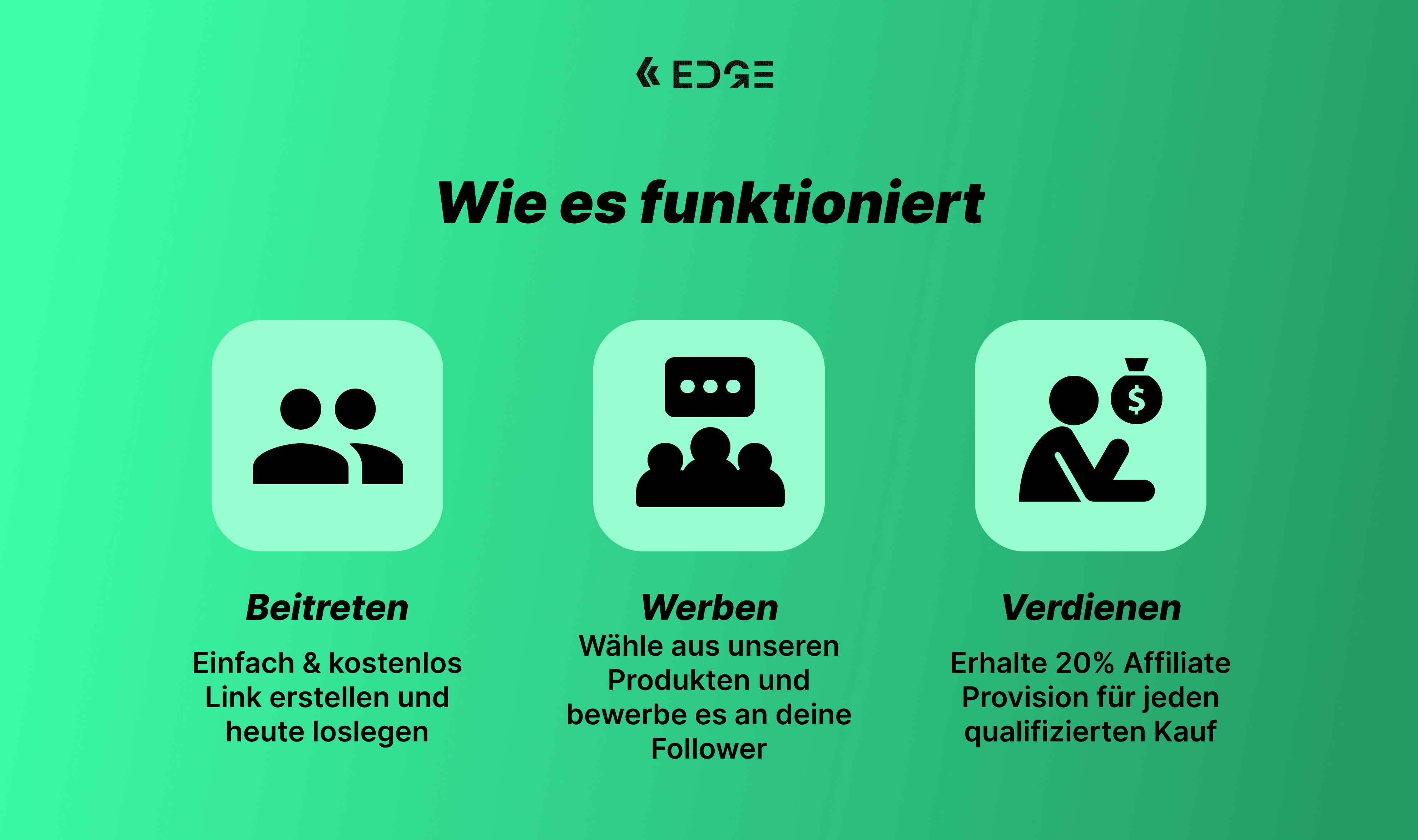 Empfehle Freunden oder Geschäftspartnern Edge und erhalte 15% Affiliate Provision für jeden qualifizierten Kunden. Leichter könnte es nicht sein.